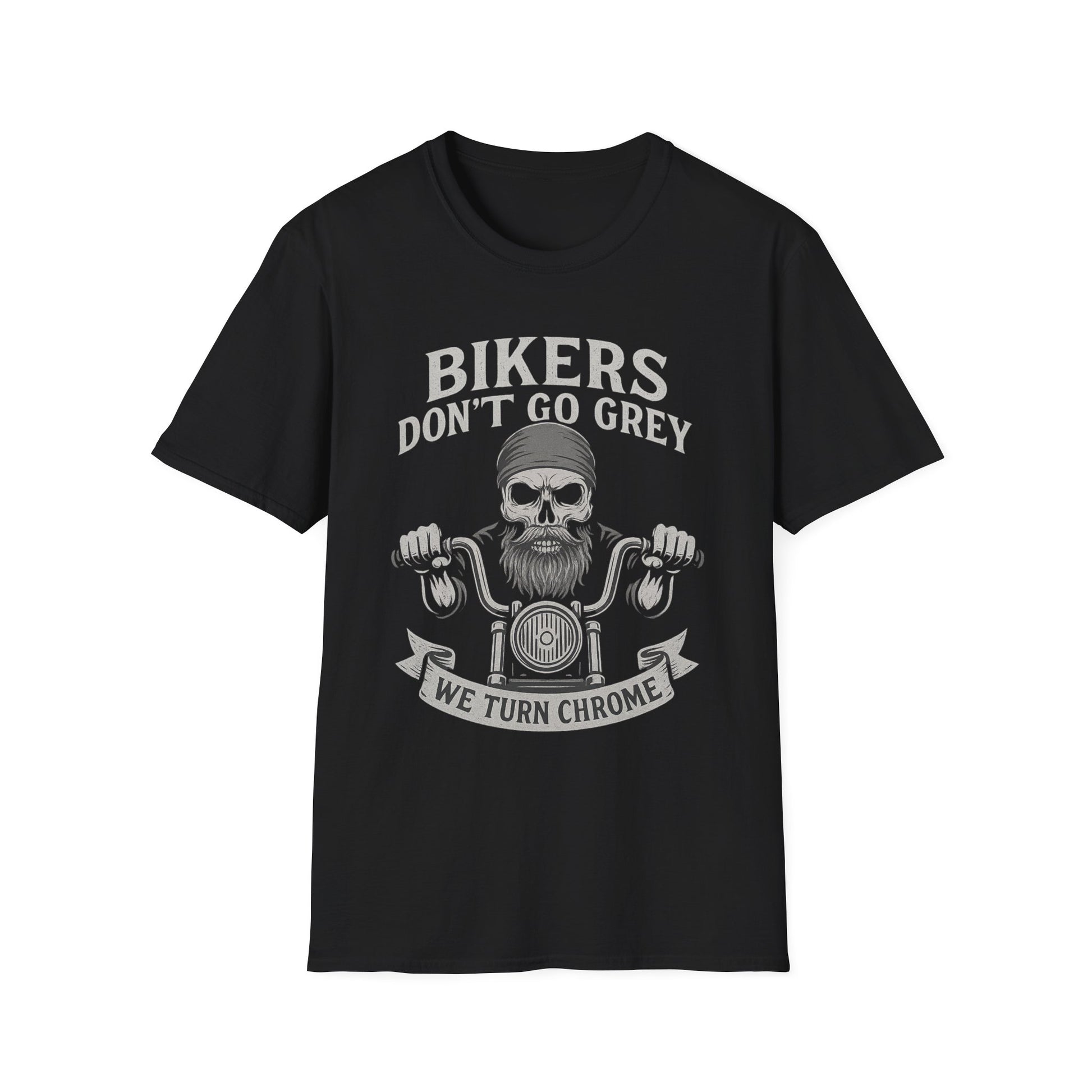Show your motorcycle pride with this badass vintage-inspired design that celebrates the timeless spirit of bikers! Featuring a detailed bearded skull biker gripping handlebars with the clever phrase "Bikers Don't Go Grey - We Turn Chrome," this shirt is perfect for riders who embrace the chrome lifestyle.
